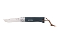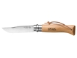 Традиційний складний ніж Opinel. Ергономічна рукоятка виготовлена з лакованої деревини граба. Лезо (довжиною 8,5 см) виготовлене з нержавіючої та модифікованої сталі Sandvik 12C27. Його лезо забезпечує чудові ріжучі властивості. Ніж оснащений системою блокування Virobloc, яка фіксує лезо у відкритому або закритому положенні. Шнурок кріпиться через отвір у рукоятці.