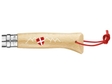 Традиційний складний ніж Opinel.Ергономічна рукоятка виготовлена з лакованого бука.Лезо (довжиною 8,5 см) виготовлене з нержавіючої та модифікованої сталі Sandvik 12C27.Його лезо забезпечує чудові ріжучі властивості.Ніж оснащений системою блокування Virobloc, яка фіксує лезо у відкритому або закритому положенні.Шнурок кріпиться через отвір у рукоятці.